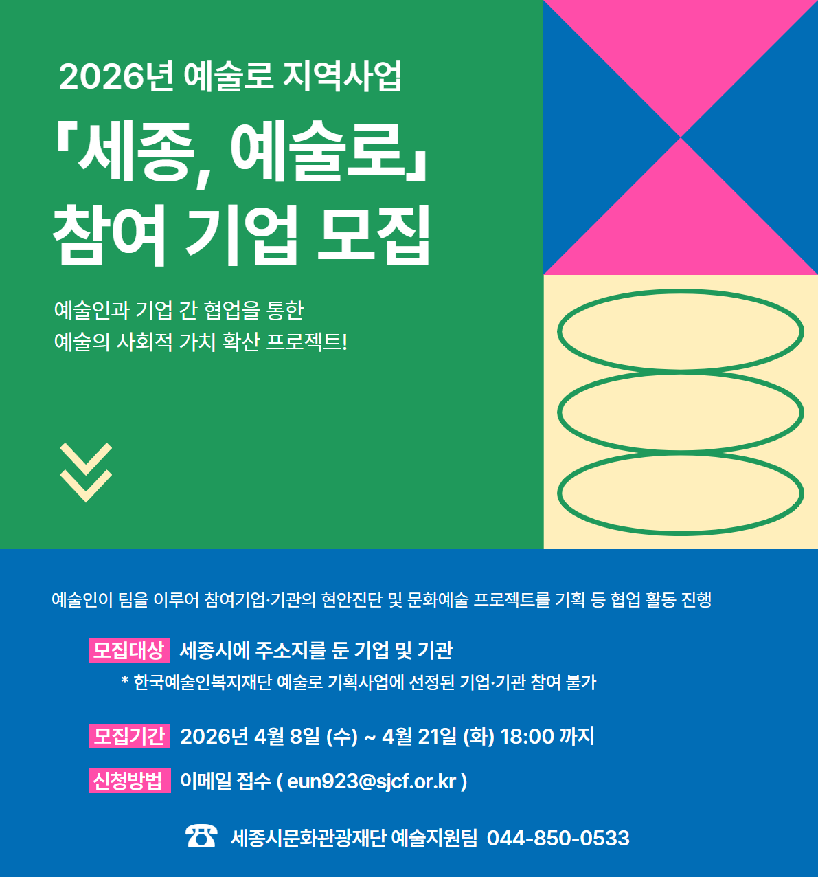 모집대상 : 세종특별자치시에 주소지를 둔 기업·기관 (* 한국예술인복지재단 예술로 기획사업에 선정되지 않은 기업·기관) 모집기간 : 2026년 4월 8일(수) ~ 4월 21일(화) 18:00 까지 신청방법 : 이메일 접수 ( eun923@sjcf.or.kr )