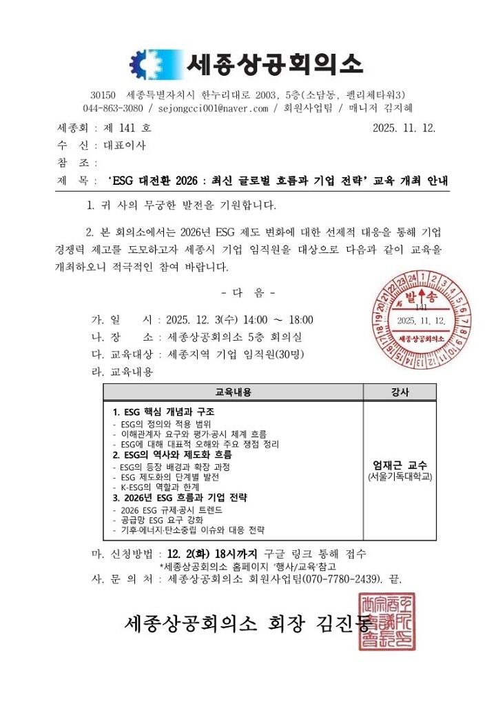 | ‒ | 'ESG 대전환 2026 : 최신 글로벌 흐름과 기업 전략' 교육 개최 안내 |